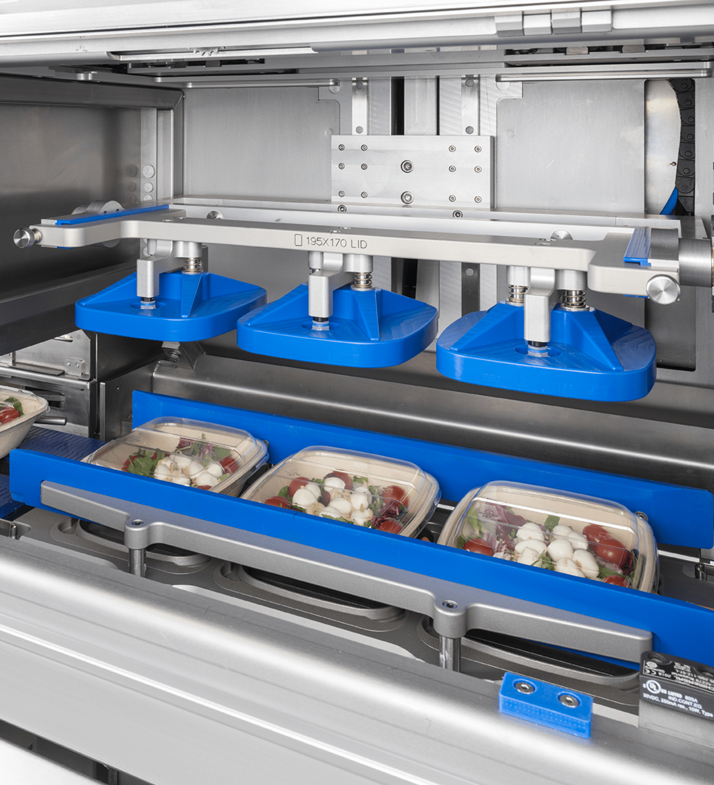 In order to lid accurately, a tray support unit is placed below the lidding unit with a combination of a centering and fixation system. It centres and secures each tray individually before the lid is positioned and applied